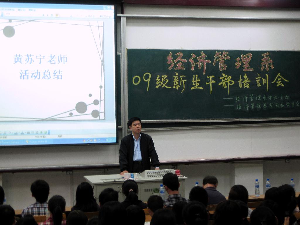 10月15日下午四点,经济管理系在辅楼104成功举办了“09级新生干部培训会”。此次培训由经济管理系学办主办,系分团委、学生会承办。经济管理系党总支副书记黄苏宁、经管系学办副主任李清源以及五位优秀学生代表分别作了发言,经管系09级全体辅导员、新生干部参加了培训会,会议由分团委书记羊栋主持。
