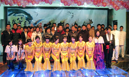 学院领导与全体演员和工作人员合影留念 12月16日晚,经济管理系在大学生活动中心举办了主题为“1216经管贺岁、 2010成贤腾飞”的迎新年晚会。学院党委副书记、副院长吴荣顺和副院长董梅芳、学工部部长唐小平、工会主席崔长征、经济管理系副书记黄苏宁、土木工程系副书记韩苏扬,各系分团委书记及经管系师生参加了晚会。 晚会在一曲喜庆热闹的舞蹈《开门红》中拉开了帷幕。董梅芳副院长和黄苏宁副书记分别致辞,向大家送上了美好的新年祝愿,对经管系全体师生在2009年取得的成绩给予肯定,希望大家在新的一年里能够百尺竿头、更上一层。 晚会的节目将传统与现代完美交融。流行歌曲串烧《中国风》;地方特色浓郁、表演细腻的豫剧《对绣鞋》;柔和、典雅给人以时空交错的梦幻感受的古典舞《十面埋伏》;具有浓郁民族风情的《美丽的草原我的家》;融合了中国古典乐器古筝、长笛、二胡、琵琶的民乐合奏《喜洋洋》,不仅表演出色,更给人以精神享受。晚会也不乏青春现代之作,幽默诙谐的话剧表演《白雪公主新传》令观众捧腹大笑;神奇、精湛的魔术表演;动感十足的现代舞《真命天子》点燃了现场的激情,张扬了青春的个性;诗朗诵《花开的日子里》、歌曲《朋友》抒发和表达了同学们美丽情怀和真挚的友谊。整台晚会精彩纷呈、掌声不断,民族舞《千手观音》成为晚会的一大亮点,博得了满堂喝彩,将整个晚会推向高潮。 在《难忘今宵》的歌声中晚会圆满结束,学院领导与全体演员和工作人员合影留念。 |