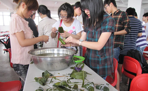 本次活动的主要内容有了解端午节习俗、包粽子和缝香囊。分团委和学生会的学生干部首先介绍了端午节的由来和习俗,大家对屈原的高风亮节和爱国主义情操有了更为深刻的了解。接着同学们开始包粽子,很多同学都是第一次包,拿到材料后迫不及待地开始动手,裹粽叶、装材料、系线。没想到一个个看似简单的粽子却需要花费颇多心思,在食堂阿姨的指导下,同学们手中的粽子出落得越来越好看。粽子下锅时,大家开始学做香囊,穿针引线,缝制香包,放入香料、随后封口,一件件精巧的工艺品便呈现出来。大家相互赠送,其乐融融。在一片欢声笑语中,香喷喷的粽子端上桌来,大小不一,形态各异,老师和同学们围坐一团,互相交流,开心地享受着自己的劳动成果。