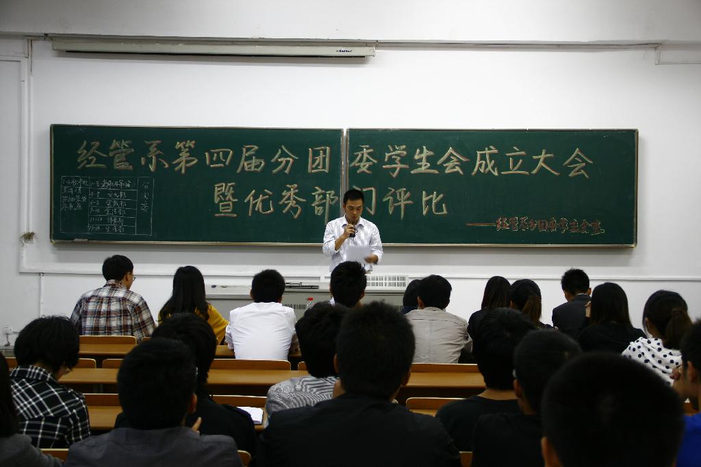2011年9月22日下午3:30,经管系第四届分团委、学生会成立大会在成贤院113顺利召开。本次大会由经管系分团委组织部承办,第四届分团委副书记张晓晓主持会议。参加本次大会的领导有:经管系党总支书记黄苏宁老师,经管系综合办主任李清源老师,以及经管系分团委书记羊栋老师。