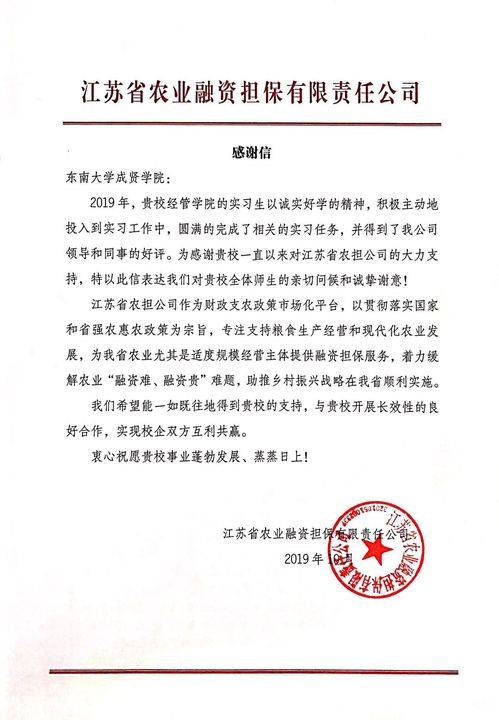 近日,BB贝博艾弗森官方网站成贤学院BB贝博艾弗森官方网站收到一封来自江苏省农业融资担保有限责任公司(以下简称“江苏省农担公司”)的感谢信。信件简短却言语真挚,表达了对BB贝博艾弗森官方网站实习生诚实好学的肯定、积极工作的赞扬,以及与学院建立长效性良好合作的期盼。