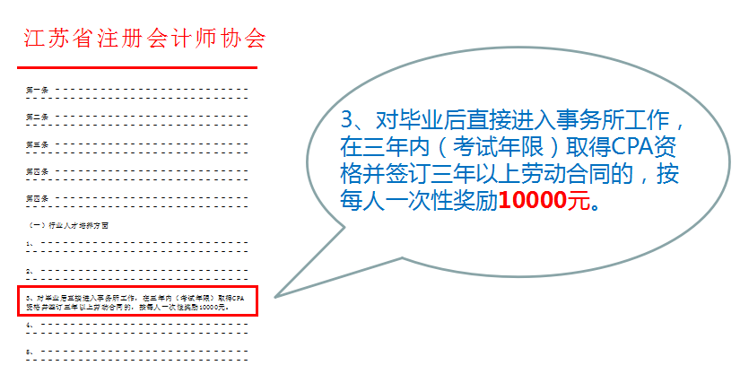各大城市对于CPA持证者提供了各项政策支持,政府津贴、人才落户、职称评定等。如江苏省对毕业后直接进入事务所工作,在三年内(考试年限)取得CPA资格并签订三年以上劳动合同的,按每人一次性奖励10000元。